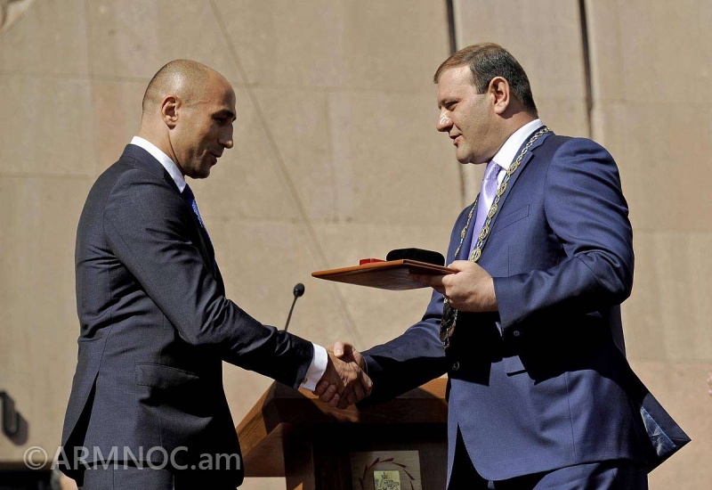 Երևանի քաղաքապետ Տարոն Մարգարյանը «Էրեբունի-Երևան» 2797-ամյակին նվիրված պաշտոնական հանդիսության ժամանակ, պրոֆեսիոնալ բռնցքամարտիկ, WBO վարկածով աշխարհի չեմպիոն Արթուր Աբրահամին հանձնեց Երևանի պատվավոր քաղաքացու կոչում: