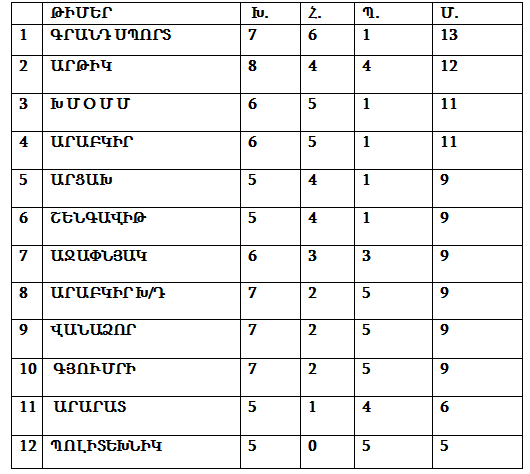 Մրցաշարային աղյուսակը հետեւյալ տեսքն ունի.