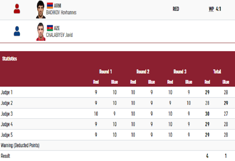 Իր ցնցող հարվածներին առավել ուժգնություն հաղորդելու նպատակով ազերի մրցակցին ասես հարվածում էր աջ և ձախ ուսագոտիներով, ասել է թե՝ միայն չէր հարվածում ոտքերով: Այդքանով հանդերձ մեր վարպետը մրցակցին գերազանցեց կարգապահությամբ, ազնիվ պայքարում հաղթեց ու մտավ քառորդ եզրափակիչ փուլ:
