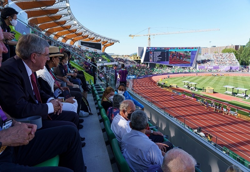 Օրեգոն նահանգի Յուջին քաղաքում Բախը հետևել է աթլետիկայի աշխարհի առաջնության մասնակիցների ելույթներին, հանդիպել մարզաձևի համաշխարհային ֆեդերացիայի նախագահ, ՄՕԿ-ի անդամ Սեբաստիան Քոուին, մասնակցել կազմակերպության գործկոմի նիստին և պատասխանել ներկաների բազմաթիվ հարցերին:
