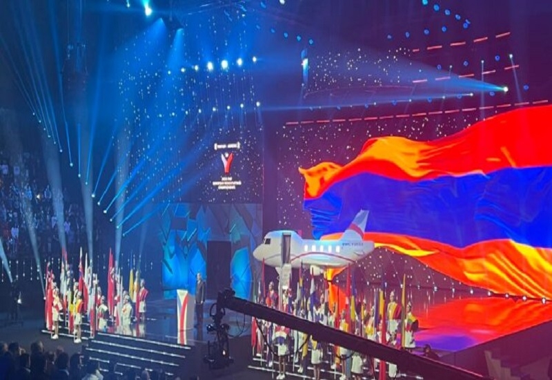 Հապա բեմահարթակ վայրէջք կատարած խորհդանշական ինքնաթիռը, որը համալիր էր բերել մասնակիցներին ՝ իրենց երկրների դրոշներով: