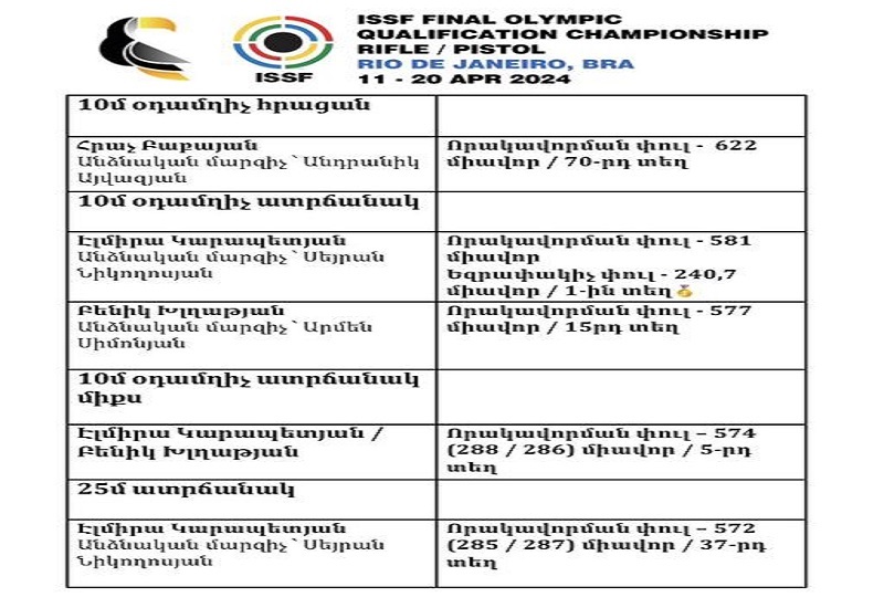 76 երկրների ավելի քան 450 հրաձիգների թվում էին մեր երկրի պատվիրակները: Արդեն հայտնի է, որ նրանցից լավագույն արդյունքով առանձնացավ Էլմիրա Կարապետյանը: Ատրճանակավարների մրցումներում, 10մ հեռավորությունից, նա վաստակեց 240. 7 միավոր, գրավեց առաջին տեղը և երկորդ անգամ հաստատեց Փարիզի խաղերում հանդես գալու իրավունքը: