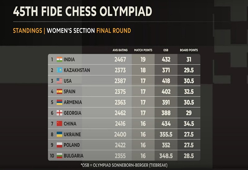 Կանանց պայքարում կրկին ոսկե դափնեկիր դարձան Հնդկաստանի պատվիրակները: Մեր շախմատիստուհիները, տղամարդկանց օրինակով, նույնպես 17 միավոր վաստակեցին: Ներկայացնենք մրցաշարային աղյուսակը.