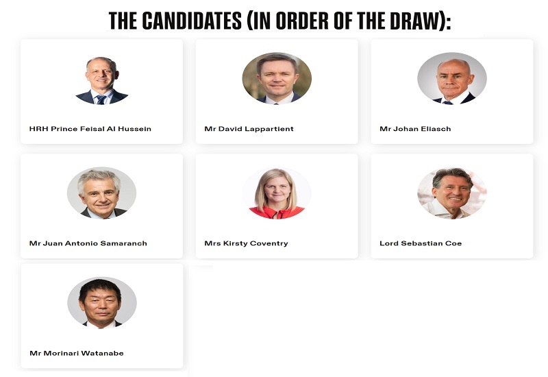 Թեկնածուներն են ՝ Հորդանանի արքայազն Ֆեյսալ իբն Հուսեյնը, բրիտանացի Լորդ Սեբաստիան Կոուն / աթլետիկայի համաշխարհային ասոցիացիայի նախագահ /, զիմբաբվեցի, միակ կին թեկնածու Քիրսթի Քովենթրին / ՄՕԿ մարզիկների հանձնաժողովի նախագահ, ՄՕԿ-ի 130-ամյա պատմությունում առաջին կին և առաջին աֆրիկացին /, իսպանացի Խուան Անտոնիո Սամարանչ կրտսերը / ժամանակակից հնգամարտի միջազգային ֆեդերացիայի առաջին փոխնախագահ, ՄՕԿ-ի յոթերորդ նախագահ Խուան Անտոնիո Սամարանչի ավագ որդին /, շվեդ Յոհան Էլիաշը / դահուկային սպորտի եւ սնոուբորդի միջազգային ֆեդերացիայի նախագահ /, ֆրանսիացի Դավիդ Լապարտիենտը / հեծանվասպորտի միջազգային միության նախագահ, Ֆրանսիայի ԱՕԿ նախագահ / և ճապոնացի Մորինարի Վատանաբեն / մարմնամարզության միջազգային ֆեդերացիայի նախագահ /: