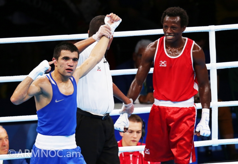 Абгарян в первом поединке среди мужчин весовой категории 52 кг мерился силами с представляющим Уганду Рональдо Серуго. Армянский боксер одержал победу со счетом 2:1.